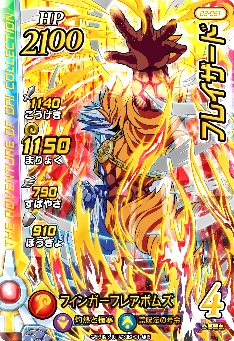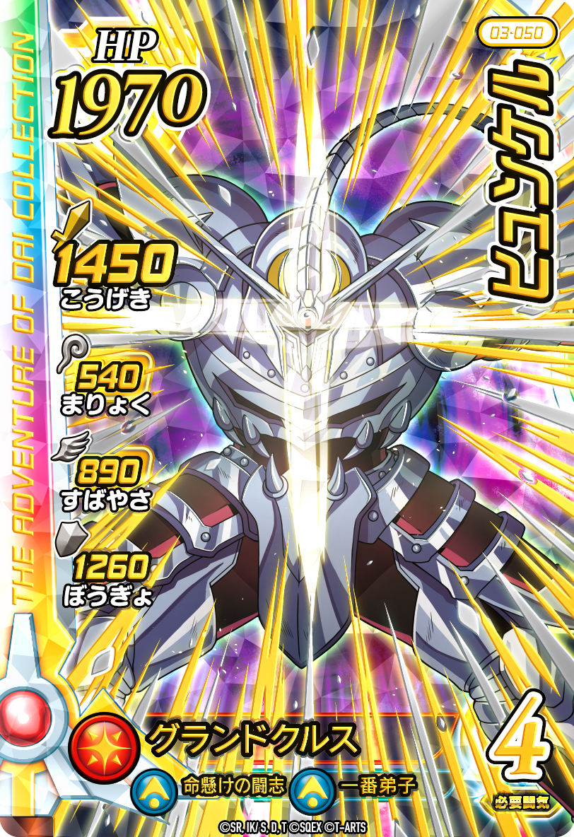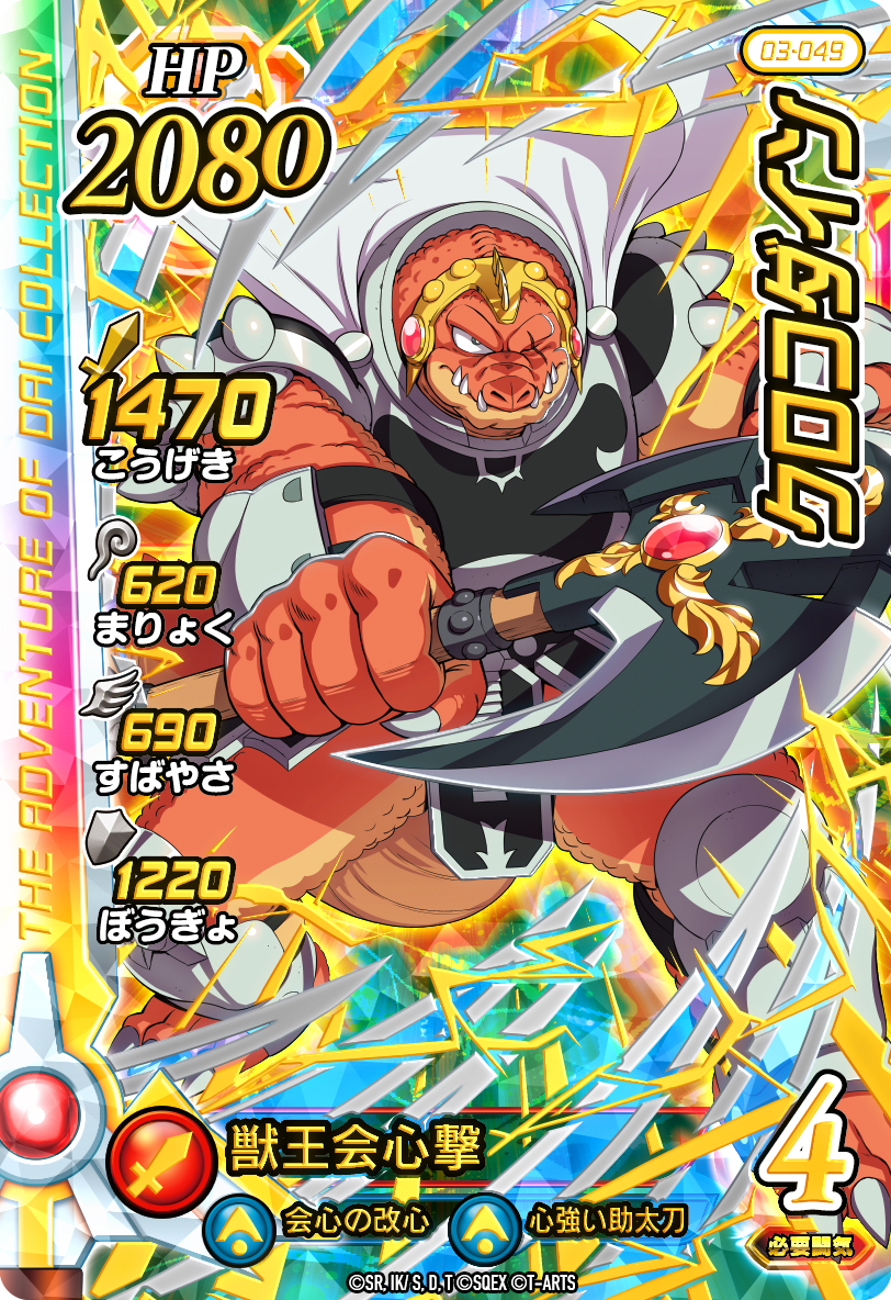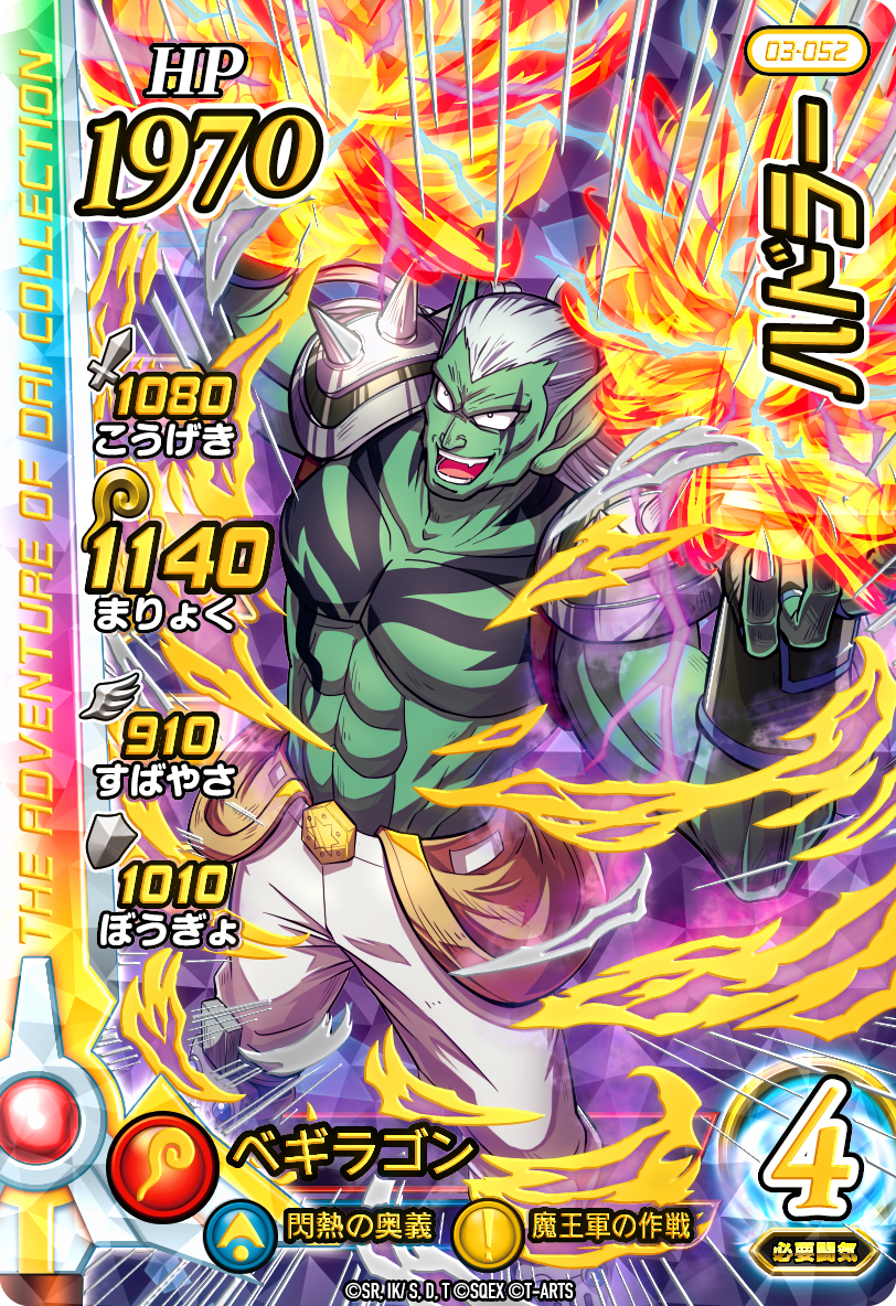 『クロスブレイド』「3弾」では、アニメでも強敵として立ちはだかる氷炎魔団長「フレイザード」がカードとして新登場します。さらに、必殺技「ライデインストラッシュ」を放つ「ダイ」や、ダイたちの味方になり必殺技「グランドクルス」を放つ光属性の「ヒュンケル」などが、ドラゴンレアカードとしてラインアップ。さらにギガレアカードとして、ドラゴンキラーを装備した「ダイ」や「鎧武装フレイザード」も登場。ますますギンギラギンに光り輝く豪華な仕様となっています。